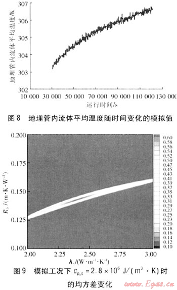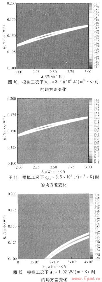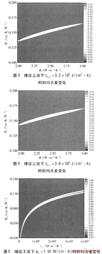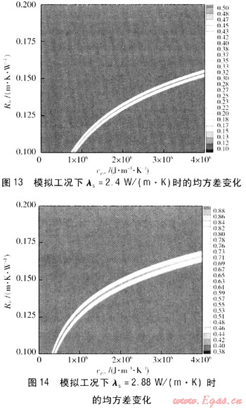 由圖2~4、9~11可知,均方差最小值的區(qū)域基本固定,其對(duì)應(yīng)的λs在2.4W/(m·K)左右。因此,可以得出結(jié)論,在實(shí)際過程中即使存在一些不確定因素的影響,得到的模擬值與理論值存在一定的偏差,但是經(jīng)過參數(shù)估計(jì)處理得到cp,s的變化對(duì)結(jié)果的影響也很小,cp,s偏差±12.5%對(duì)λs的影響在±2%左右。通常情況下cp,s的獲得可以依據(jù)現(xiàn)場(chǎng)鉆孔中心巖土分析來確定,相對(duì)誤差一般在±5%以內(nèi),對(duì)λs的影響更小。