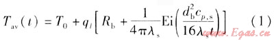 地埋管換熱器的傳熱模型主要有線熱源模型、柱熱源模型。線熱源模型是基于1948年Ingersoll和Plass等人發(fā)展的Kelvin線熱源理論[8]。工程上常見的地埋管換熱器的直徑一般為26~36mm,鉆孔深度為40~200m,與鉆孔深度相比,地埋管的直徑很小。在地埋管換熱器工作時(shí),相當(dāng)于在半無限大介質(zhì)中,鉆孔中心的一根線熱源與周圍巖土進(jìn)行熱交換。另外,假設(shè)沿地埋管長(zhǎng)度方向傳熱量忽略不計(jì),周圍巖土均勻且線熱源與巖土的傳熱量恒定。由于該方法不受具體換熱器形式的限制,計(jì)算較簡(jiǎn)單,且能滿足一般工程中土壤源熱泵系統(tǒng)設(shè)計(jì)計(jì)算的要求,具有較廣泛的實(shí)用性。根據(jù)假設(shè),可以得到地埋管內(nèi)流體平均溫度與鉆孔周圍巖土初始平均溫度及其他參數(shù)之間的關(guān)系式[9]: