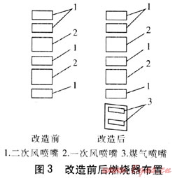 鍋爐原煤粉燃燒器為四角切圓布置,考慮到煤氣燃燒與煤粉燃燒的兼容性和爐內(nèi)空氣動(dòng)力場(chǎng)的穩(wěn)定性,煤氣燃燒器仍以切圓布置方式為宜。經(jīng)計(jì)算,若煤氣燃燒器采用布置在原煤粉燃燒器下的四角切圓燃燒,則要求原煤粉燃燒器下層噴嘴至運(yùn)行層的間距應(yīng)不小于1000mm,而實(shí)際間距僅有700mm,四角切圓方案難以實(shí)現(xiàn)。因此,煤氣燃燒系統(tǒng)最終采用六角切圓布置方式,其中4只煤氣噴嘴直接布置在煤粉噴嘴下部,另外2只煤氣噴嘴布置在左右側(cè)墻的中心,主煤氣輸送管道進(jìn)入鍋爐房后分為兩根煤氣分管道布置于鍋爐兩側(cè),每根分管道再各分出3根支管連接煤氣燃燒器,見圖2。為擴(kuò)大切圓直徑,增加受熱面的吸熱量,降低火焰中心位置,煤氣燃燒器出口軸線分別在原煤粉燃燒器噴嘴出口軸線方向上水平向外偏轉(zhuǎn)20°,向下偏轉(zhuǎn)20°。改造前后燃燒器布置見圖3。綜合考慮低熱值煤氣著火與燃燒的穩(wěn)定性及火焰的長度,煤氣燃燒器采用雙通道煤氣噴嘴,具有部分預(yù)混作用,噴嘴出口煤氣流速約32m/s,空氣流速約35m/s[4~7]。