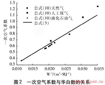 一次空氣系數(shù)與華白數(shù)的關(guān)系見(jiàn)圖2,可以看出按式(10)計(jì)算出的一次空氣系數(shù)與華白數(shù)近似成反比關(guān)系。欲準(zhǔn)確計(jì)算,還是應(yīng)該采用式(10)。