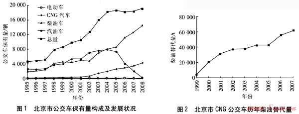 圖1為北京市公交車(chē)保有量構(gòu)成及發(fā)展?fàn)顩r,它顯示了1995—2008年北京市公交車(chē)總量以及其中汽油車(chē)、柴油車(chē)、CNG車(chē)和電動(dòng)車(chē)這4種不同燃料類(lèi)型汽車(chē)的發(fā)展趨勢(shì)??梢钥闯?,在1999—2008年這10年間,北京市天然氣公交車(chē)保有量的年均(3年滑動(dòng)平均)增長(zhǎng)率達(dá)到了21%,遠(yuǎn)高于同期北京市公交車(chē)總保有量7%的增長(zhǎng)率,天然氣公交車(chē)同時(shí)也是各類(lèi)公交車(chē)型中增長(zhǎng)速度最快的車(chē)型。