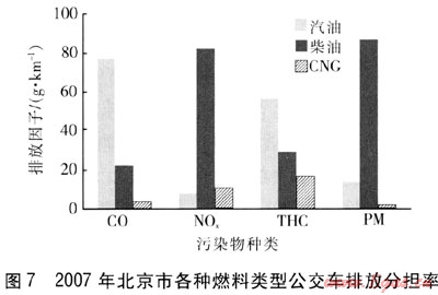 根據(jù)對(duì)2007年北京市現(xiàn)有公交車(chē)排放清單的分析,可以獲得各燃料類(lèi)型公交車(chē)的排放分擔(dān)率,見(jiàn)圖7。雖然CNG公交車(chē)在北京市公交車(chē)車(chē)隊(duì)中占有20%的比例,但是不論是哪種污染物,其排放分擔(dān)率都顯著低于20%,尤其對(duì)于北京市大氣環(huán)境最為重要的控制污染物PM而言,其1%的低分擔(dān)率意義非同小可。對(duì)于公交車(chē)最引人關(guān)注的NOx和PM兩種污染物,柴油公交車(chē)都是最主要的排放源,其分擔(dān)率都超過(guò)了80%,使用CNG公交車(chē)替代柴油公交車(chē)可以有效地降低公交車(chē)NOx和PM總排放量。