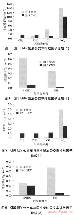 圖5、6為目前北京市排放控制水平最高的CNG EEV車(chē)型與國(guó)4柴油車(chē)排放的對(duì)比??梢钥闯觯?/span>