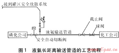 本項(xiàng)目在液氨長距離輸送管道的起點(diǎn)磷化公司廠區(qū)內(nèi)設(shè)置球閥1個(gè),且為了保證出廠壓力及預(yù)防管道破損等事故,安裝了安全自動(dòng)切斷閥1個(gè),閥后設(shè)安全放散閥組1套,連接到廠區(qū)罐區(qū)內(nèi)的安全放散系統(tǒng);為控制管道的末端壓力,且為保證將來檢修方便,在終點(diǎn)化工公司廠區(qū)內(nèi)設(shè)置截止閥和球閥各1個(gè)。工藝流程見圖1。