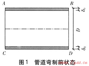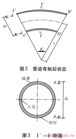 天然氣高壓管道進(jìn)行彎制時(shí),管道彎曲段受力變形,彎制前狀態(tài)見(jiàn)圖1,彎制后狀態(tài)見(jiàn)圖2,彎曲段Ⅰ′-Ⅰ′斷面見(jiàn)圖3。管道在彎制過(guò)程中,內(nèi)側(cè)管壁受壓力,由于擠壓作用管壁由直線形(如CD段)變成圓弧形(如C′D′段),管壁由于壓縮變短而增厚;外側(cè)管壁受拉力,由于拉伸作用管壁由直線形(如AB段)變成圓弧形(如A′B′段),管壁由于拉伸變長(zhǎng)而減薄。管壁減薄會(huì)使強(qiáng)度降低,為保證管壁減薄后仍有足夠強(qiáng)度,要求管壁有一定厚度,在彎曲段管壁減薄應(yīng)均勻。