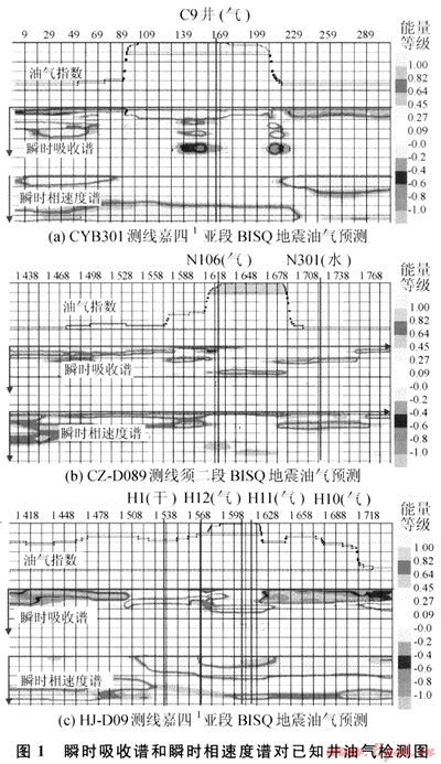 雙相介質(zhì)BISQ理論地震油氣預(yù)測的新思路、新方法能否實現(xiàn)最佳應(yīng)用需要實踐的檢驗,因此對川中、川西南、川南三個地區(qū)的7個構(gòu)造和1個區(qū)塊的5個層段(須四段、須二段、嘉四1亞段-嘉三段、嘉二1亞段-嘉一段、下二疊統(tǒng))的36口(氣井15口,氣水同產(chǎn)井2口,水井4口,干井13口,氣枯竭井2口)已知井進(jìn)行檢驗。經(jīng)分析、研究發(fā)現(xiàn)瞬時吸收譜和瞬時相速度譜的油氣性有如下特征(圖1):①正常性的地層或地質(zhì)因素在瞬時吸收譜和瞬時頻散譜上為大范圍連續(xù)成片的背景反映;②低頻段為相對孤立的強(qiáng)吸收異常和高頻散異常,異常呈透鏡狀j眼球狀、并相伴出現(xiàn),該異常與油氣圈閉有直接的對應(yīng)關(guān)系;③某個頻段為相對孤立的強(qiáng)吸收和高頻散異常,也與含油氣圈閉有直接關(guān)系;④干井、水井無上述異常現(xiàn)象,在氣水共存區(qū),也無上述的異常特征。