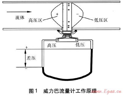 威力巴流量計(jì)采用一種差壓式的流量探頭,其計(jì)算模型和其他差壓式流量計(jì)(如孔板流量計(jì)[7~8])的數(shù)學(xué)模型相同。威力巴流量計(jì)的工作原理見(jiàn)圖1。其計(jì)算模型為: