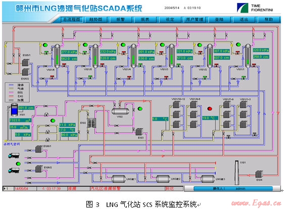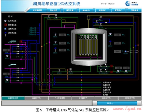 SAE-LSMS系統(tǒng)已成功在國內應用多年,2005年深圳美視電廠總管式增壓40kfg,氣化量48,000NM3/H,2007年深圳燃氣集團梅林LNG應急調峰站單元式增壓20kfg,氣化量小時40,000NM3/H,2008年南京港華兩個2500立方LNG子母罐氣化站均已應用該系統(tǒng)。均取得了較好的效果。圖5為廣東潮州子母罐式LNG氣化站SCS系統(tǒng)監(jiān)控畫面。
