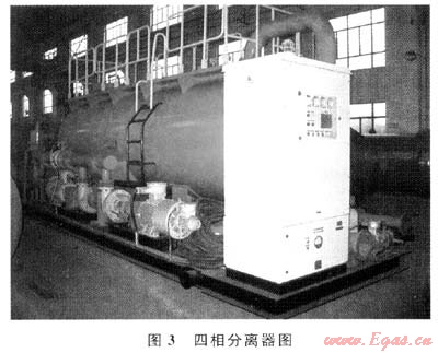 四相分離器在密閉系統(tǒng)中發(fā)揮重要作用,是其核心裝備。密閉系統(tǒng)中的儲油罐、沉砂罐、鉆井液緩沖罐等后續(xù)設(shè)備都是為該裝備服務(wù),該裝備的分離效率穩(wěn)定與否直接關(guān)系到整個密閉系統(tǒng)能否正常運行。美國、加拿大、英國等國家的一些石油公司相繼研制出了鉆井液四相分離裝置,并進行了多次現(xiàn)場使用。目前川慶鉆探工程公司鉆采工藝技術(shù)研究院對四相分離器進行了研制(圖3),并取得了重要進展[3~7]。