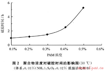 將不同質(zhì)量分?jǐn)?shù)的PAM加入相同的氧化還原體系,并加入調(diào)節(jié)劑A后,與ZrOCl2為1%的溶液按100:3.5的配比混合進(jìn)行交聯(lián),測得在40℃破膠時間(圖2)。