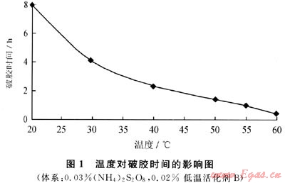 在高于50℃的條件下,過硫酸銨分解反應(yīng)所需要的能量由周圍環(huán)境提供,反應(yīng)能順利進(jìn)行;而在煤層溫度(20~40℃)時,由于周圍環(huán)境不能很好提供過硫酸鹽分解所需的能量,過硫酸鹽的游離氧釋放速度大大降低,因而其破膠能力迅速下降。氧化還原體系是通過低溫活化劑劑引發(fā)過氧化物的自由基,在低溫下釋放出氧破壞凍膠結(jié)構(gòu),使大分子降解從而達(dá)到破膠的目的[4~5]。低溫活化劑與過硫酸銨作用為放熱反應(yīng),并且有一定的延遲釋放特性。