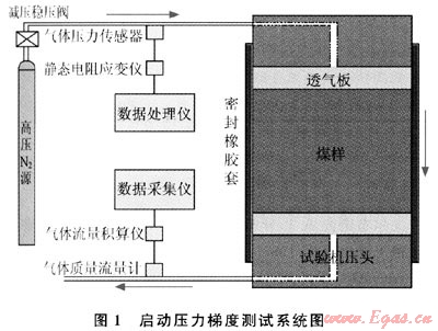 樣品采自陽泉煤電集團寺家莊煤礦的15#煤層,加工成Φ50×50mm的煤心,實驗系統(tǒng)包括密封橡膠套、試驗機加載及控制系統(tǒng)、高壓氣源、氣體流量及壓力測試等幾部分(見圖1)。