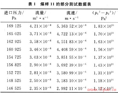 RMT-150B伺服試驗機加載的軸向力4kN,圍壓2MPa,為了保證測試過程封閉良好,所加氣壓不超過圍壓2MPa。實驗采用“倒退法”:即先將氣壓調(diào)到較高值燃后關閉穩(wěn)壓閥門,測試一系列壓力梯度對應的流量。以煤樣11為例,由于出口端直通大氣,因此式(4)中的p2=p0=101325Pa,部分測試數(shù)據(jù)見表1,計算的滲透率為0.2mD,流速與壓力平方差的關系見圖2。