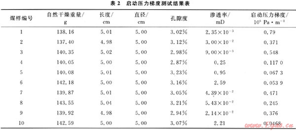 依上述的測試手段和啟動壓力梯度計算方法,對同一煤樣鉆取的其余10個煤心進行測試和計算,樣品信息和結果見表2。