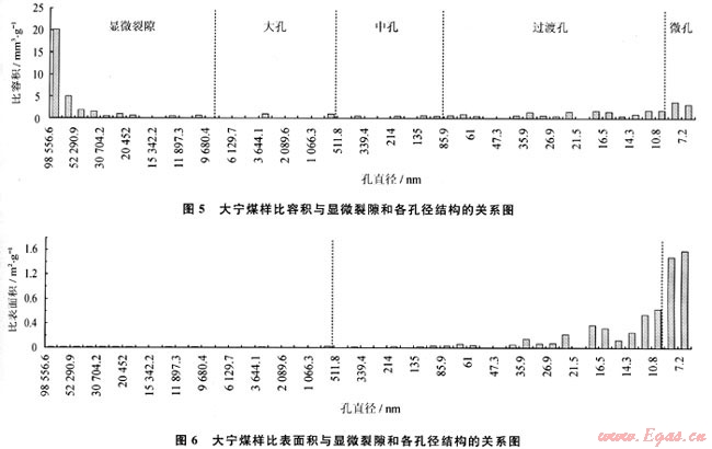 在煤層氣排采過程中,當(dāng)儲(chǔ)層壓力、水產(chǎn)量處于連續(xù)穩(wěn)定下降階段時(shí),氣產(chǎn)量仍然呈現(xiàn)出較大的波動(dòng),其影響因素是煤層氣的解吸特征,最終受控于煤的孔徑結(jié)構(gòu)。煤中顯微裂隙(壓汞孔徑D>10000nm)和各孔徑(大孔:1000nm<D<10000nm;中孔:100nm<D<1000nm;過渡孔:10nm<D<100nm;微孔D<10nm)的比容積、比表面積的分布是不連續(xù)的(圖5、6),比容積主要分布在顯微裂隙、過渡孔和微孔中,比表面積則以微孔和過渡孔占絕對(duì)優(yōu)勢(shì)(表1、2)。在煤層氣的解吸過程中,當(dāng)解吸到某一孔徑段時(shí),因孔容、孔表面積的變化導(dǎo)致產(chǎn)氣速率變化,氣產(chǎn)量也呈現(xiàn)波動(dòng)(盡管氣產(chǎn)量是一個(gè)綜合效應(yīng),當(dāng)解吸到某一優(yōu)勢(shì)孔徑時(shí)氣產(chǎn)量仍然會(huì)呈現(xiàn)出強(qiáng)勢(shì))。