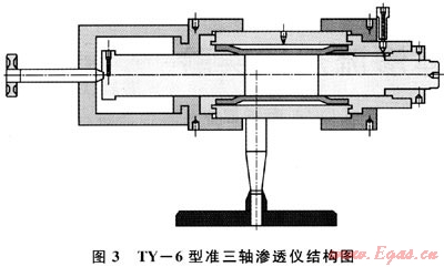 實(shí)驗(yàn)系統(tǒng)為CGMS煤層瓦斯氣液相對滲透率測試系統(tǒng)準(zhǔn)三軸滲透儀及恒溫系統(tǒng)。CGMS煤層瓦斯氣液相對滲透率測試系統(tǒng)主要包括6個(gè)子系統(tǒng):物理模擬系統(tǒng)、流程管匯系統(tǒng)、環(huán)壓系統(tǒng)、計(jì)量系統(tǒng)、數(shù)據(jù)自動(dòng)采集控制系統(tǒng)、實(shí)驗(yàn)數(shù)據(jù)處理系統(tǒng)。相應(yīng)的系統(tǒng)實(shí)物圖、示意圖及結(jié)構(gòu)圖如圖1~3所示。