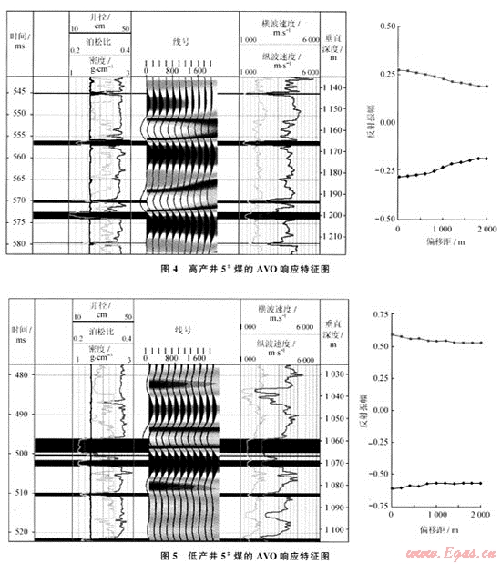 通過(guò)對(duì)煤層氣井的AVO數(shù)值模擬,獲得井的AVO信息,將此信息同地震測(cè)線AVO屬性進(jìn)行比較,以尋找AVO異常區(qū)。選擇離地震測(cè)線較近的井進(jìn)行AVO正演數(shù)值模擬,從井旁CDP道集中反復(fù)提取地震子波,使提取的地震子波與反射系數(shù)進(jìn)行褶積,得到合成CDP道集。將合成CDP道集與實(shí)際CDP道集進(jìn)行比較,誤差值最小的CDP道集即為最終合成CDP道集。然后對(duì)其進(jìn)行AV0反演處理,獲得截距、梯度屬性剖面。在AVO正演數(shù)值模擬獲得的合成CDP道集上,對(duì)應(yīng)5#煤層的同相軸展示了振幅隨偏移距增大而減小的特征,和AVO反演結(jié)果對(duì)應(yīng)的關(guān)系是:對(duì)于負(fù)同相軸,是負(fù)截距、正梯度異常;對(duì)于正同相軸,是正截距、負(fù)梯度異常,這正是煤層氣富集的反映。
