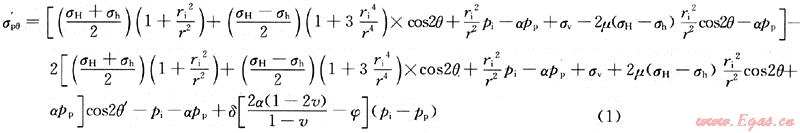 從式(1)可以看出:當(dāng)pi增大時,σ′pθ變??;當(dāng)pi增到一定程度時,σ′pθ將變成負(fù)值,即巖石所受周向應(yīng)力由壓縮變?yōu)槔?,?dāng)這種拉伸力大到足以克服巖石的抗拉強度時,地層則產(chǎn)生破裂,此時值為破裂壓力。