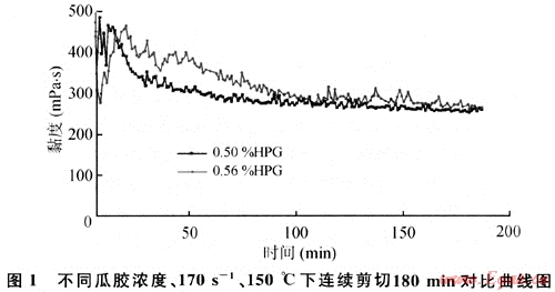 根據(jù)液體流變性測試方法[2],在實驗室通過HAAKE-RS600流變儀測得了不同粉比瓜膠所配置的交聯(lián)凍膠的流變性(見圖1)。