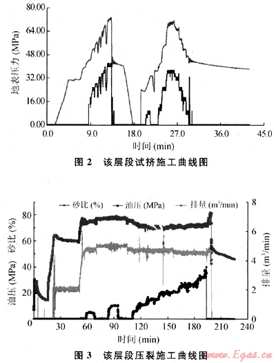 圖2為FS-3井4825.8~4852.2m層段的試擠施工曲線。從試擠曲線可以看出,提排量井口壓力升至73MPa地層破裂,降排量之后的停泵測壓降表明地層吸液能力較好??紤]到該層吸液能力較好,因此提出了將前置液量增加30m3。從FS-3井的壓裂施工曲線(圖3)可以看出,本層段施工注入預(yù)置液60m3、總液量717.6m3,加入0.45~0.9mm的Carbo陶粒70m3,平均砂比20%,最高砂比達(dá)39%。該層段施工圓滿完成了70m3的加砂任務(wù)。采用凈壓力擬合軟件,對該層位施工曲線進行了凈擬合分析,擬合的縫長為208.3m,達(dá)到了造長縫的設(shè)計要求,表明該井得到了有效的改造。據(jù)該層段壓后排液數(shù)據(jù)統(tǒng)計,該井小型壓裂進液20m3,大型壓裂進液711.3m3,井筒以1500m計算60m3,累計791.3m3,返排96.3%,如不考慮小型壓裂,則返排率98.8%;壓后產(chǎn)氣量高達(dá)5.6×104m3/d,達(dá)到了良好的預(yù)期效果,表明對該井采取的壓裂技術(shù)措施總體是可行的。