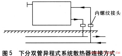 下分雙管異程式系統(tǒng)適用于中小面積戶型,如兩室兩廳兩衛(wèi),建筑面積約120m2,其調(diào)節(jié)性能優(yōu)于下分單管式系統(tǒng)。散熱器連接方式見(jiàn)圖5,供回水塑料管由三通引出后,采用內(nèi)螺紋接頭與地面上鍍鋅鋼管連接,但此處需預(yù)留施工槽,以便檢修三通管件。