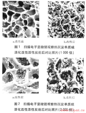 對(duì)活性炭吸附能力起支配作用的是微孔的比例,經(jīng)過(guò)熱沉淀單質(zhì)硫活化改性后的活性炭比表面積增加,在表面以及內(nèi)部沉積硫顆粒,對(duì)汞的吸附能力大為增強(qiáng),而且硫與汞化學(xué)結(jié)合后能防止汞的再逸出。掃描電子顯微鏡觀察熱沉淀單質(zhì)硫活化改性活性炭前后對(duì)比照片(1000、2000倍)見(jiàn)圖1、2。由圖1可知,改性后的活性炭微孔比例顯著增加,由此活性炭的比表面積也增大,從而吸附能力也大幅增強(qiáng)。由圖2(與圖1為同一區(qū)域)可知,在改性后的活性炭微孔結(jié)構(gòu)中,大量沉積的硫與活性炭化合,形成親單質(zhì)汞的化合物,由此極大地提高活性炭對(duì)單質(zhì)汞的脫除能力。由Nucon公司生產(chǎn)的經(jīng)過(guò)熱沉淀單質(zhì)硫活化改性的活性炭的脫汞效率可提高70%以上。經(jīng)過(guò)碘化改性的活性炭,在同樣條件下,吸附脫汞能力是未經(jīng)改性活性炭的160倍[18],可以極大地減少活性炭用量。