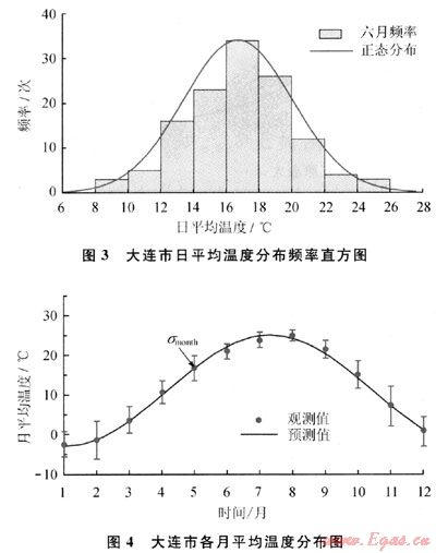 通過(guò)對(duì)大連市多年來(lái)溫度數(shù)據(jù)的分析發(fā)現(xiàn),在大連地區(qū)一年中,每個(gè)月的日平均溫度(T)近似服從正態(tài)分布,如圖3所示。該分布的期望為Tm,方差為σm2,即:T~N(Tm,σm2),其中,Tm因月份的不同而不同,σm2則在全年中波動(dòng)較小,如圖4所示。