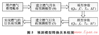 通常,燃?xì)庳?fù)荷的月負(fù)荷預(yù)測(cè)模型比較容易建立。因?yàn)椋ㄟ^(guò)統(tǒng)計(jì)待預(yù)測(cè)地區(qū)的月燃?xì)赓M(fèi)用賬單,就能夠比較方便地建立月負(fù)荷預(yù)測(cè)模型。相反,由于目前我國(guó)城市燃?xì)庳?fù)荷計(jì)量體系尚不完備,因此燃?xì)馊肇?fù)荷計(jì)量數(shù)據(jù)的收集較為困難,這也給燃?xì)馊肇?fù)荷的預(yù)測(cè)帶來(lái)諸多不便。所以我們可以利用上述方法,通過(guò)預(yù)測(cè)模型(9)來(lái)間接地得到燃?xì)馊肇?fù)荷預(yù)測(cè)模型,從而實(shí)現(xiàn)燃?xì)馊肇?fù)荷預(yù)測(cè)。其轉(zhuǎn)換關(guān)系如圖5所示。