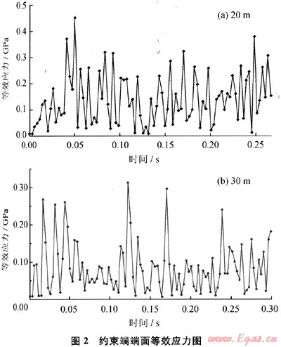 從20m和30m的射孔管柱約束端端面等效應(yīng)力數(shù)據(jù)圖看出(圖2),都存在正值的拉伸應(yīng)力,重力載荷對(duì)射孔管柱產(chǎn)生了預(yù)應(yīng)力作用,隨后應(yīng)力從正值開始降低而來(lái)回震蕩,這個(gè)階段射孔沖擊載荷對(duì)射孔管柱起作用了。20m射孔管柱模型計(jì)算結(jié)果的等效應(yīng)力的最小值σmin=6.98MPa,最大值σmax=449.92MPa;而30m射孔管柱模型計(jì)算結(jié)果的等效應(yīng)力最小值σmin=6.81MPa,最大值σmax=311.98MPa。