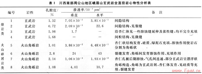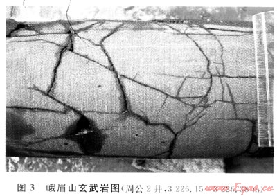 研究區(qū)玄武巖裂縫以成巖裂縫和構(gòu)造裂縫為主(圖3)。成巖裂縫包括因內(nèi)外散熱不均,冷縮作用形成的一些柱狀節(jié)理,收縮縫、晶間縫;構(gòu)造裂縫是構(gòu)造應(yīng)力的產(chǎn)物。按傾角分為水平縫、斜交縫、垂直縫,據(jù)巖心統(tǒng)計,三者數(shù)量比例大致為1:2:2,其中垂直縫和斜交縫較寬(最寬可達2cm),水平縫較窄大多為全充填縫。巖石裂縫發(fā)育程度不均,一般(2~3)條/m、最多達12條/m;普遍發(fā)育寬0.05~2.0mm的微裂縫,周公2井薄片見遇率達55%,但多被充填或半充填并常伴溶蝕現(xiàn)象。綜上所述,峨眉山玄武巖是由原生氣孔、溶蝕孔洞和裂縫構(gòu)成的孔洞-裂縫型儲層。