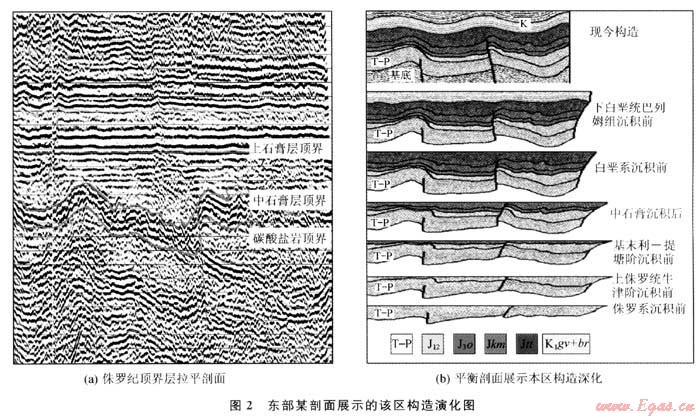 在上侏羅統(tǒng)卡洛夫-牛津階沉積完畢之后,圖蘭地臺(tái)回返,中央卡拉庫(kù)姆隆起抬升,而阿姆河盆地區(qū)域則繼續(xù)沉降,由此形成了盆地區(qū)域內(nèi)封閉的海洋沉積環(huán)境。沉積了巨厚的鹽膏層。從地震剖面上可以清楚地反映出該套鹽膏層受擠壓后流動(dòng)變形的形態(tài),以往的認(rèn)識(shí)認(rèn)為[4],鹽膏層發(fā)生塑性流動(dòng)的擠壓力是由晚古近世開(kāi)始的新構(gòu)造運(yùn)動(dòng)作用的結(jié)果。但通過(guò)平衡剖面和層拉平剖面技術(shù)清晰地反映出了在該套鹽膏層中部的中石膏沉積完畢之后即發(fā)生一期強(qiáng)烈的構(gòu)造運(yùn)動(dòng),該期構(gòu)造運(yùn)動(dòng)不僅僅使鹽膏層發(fā)生塑性流動(dòng)而形變。更重要的是本區(qū)的構(gòu)造格局因此而改變,同時(shí)本區(qū)部分構(gòu)造圈閉也在此時(shí)形成。