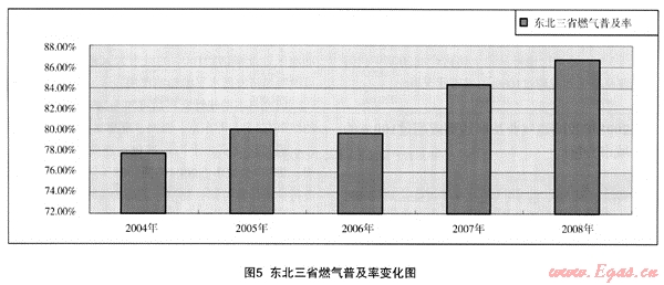 (2) 區(qū)域的燃?xì)馄占奥什⒉荒芡耆砀魇 ⑹?、自治區(qū)的燃?xì)馄占奥仕健?008年的情況看,東部地區(qū)的海南省只有73%,而中部地區(qū)的江西省燃?xì)馄占奥试?0%以上,西部地區(qū)的重慶市也在90%以上。因此,作為規(guī)劃設(shè)計(jì)的重要計(jì)算數(shù)據(jù)使用時(shí),還應(yīng)該進(jìn)行具體分析,但東部地區(qū)普及率應(yīng)該在全國(guó)的平均數(shù)以上。