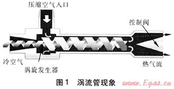 渦流管又稱Ranque Hilsch管,是一個沒有運動部件、結(jié)構(gòu)非常簡單的能量分離裝置[1]。氣體在降壓過程中,經(jīng)過特殊設(shè)計的渦流管時,可以分為冷熱兩股氣流,這種現(xiàn)象稱為渦流管現(xiàn)象,見圖1。