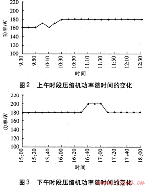 在空調(diào)模式下,工作設備主要有空調(diào)壓縮機、空調(diào)風機、加壓風機。在實驗過程中,測試開始后0.5h系統(tǒng)進入穩(wěn)定階段,采用功率表測試這3個設備的功率。上下午時段空調(diào)壓縮機功率的測試數(shù)據(jù)分別見圖2、3。由圖2、3可知,在上午時段,壓縮機的最大功率達到180W,最小功率為160W。在下午時段,最大功率達到了200W,其余時段保持在180W。