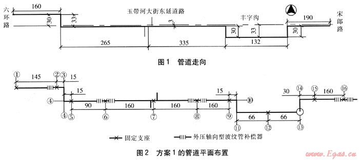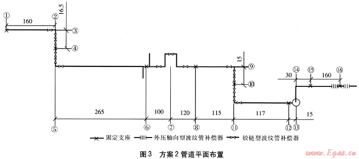 將方案1中節(jié)點1~15與方案2進行對比可知,方案1共有固定支座10個,其中2、5、9、15為大推力固定支座,而方案2在平面轉(zhuǎn)角處利用鉸鏈型波紋管補償器,加大補償段長度,并在中間長直管段上利用管道穿越障礙埋設(shè)較深的條件,設(shè)置豎向方形彎利用鉸鏈型波紋管補償器補償直管段熱伸長,減少了大推力固定支座數(shù)量。