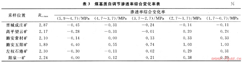 把煤基質(zhì)正、負(fù)效應(yīng)進(jìn)行疊加,即可得到煤基質(zhì)自調(diào)節(jié)綜合滲透率變化率結(jié)果(表3)。