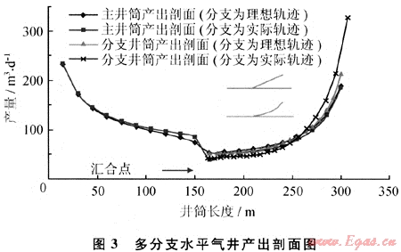 如圖3所示(以一分支井為例),彎曲分支對主井筒的產(chǎn)出剖面影響更大(圖中匯合點(diǎn)處),而分支井筒的產(chǎn)出剖面兩者也有很大區(qū)別。因此,在實(shí)際產(chǎn)能預(yù)測過程中,必須選用根據(jù)實(shí)際鉆井軌跡來劃分分支井段,從而實(shí)現(xiàn)對彎曲井筒的模擬,達(dá)到更好的預(yù)測效果。