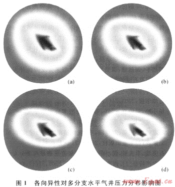 從圖1中可以看出,考慮氣藏各向異性后,多分支水平井近井地帶壓力分布發(fā)生了一定的偏轉(zhuǎn),各方向滲透率差異越大,壓力分布圖偏轉(zhuǎn)的越嚴(yán)重。