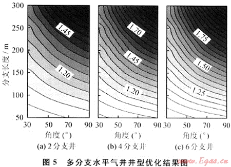 綜合來看,應(yīng)有如下優(yōu)化結(jié)論:①應(yīng)采取4分支以上的分支數(shù)目;②分支角度應(yīng)不小于30°;③分支長度根據(jù)氣藏需求選用盡可能大的長度。