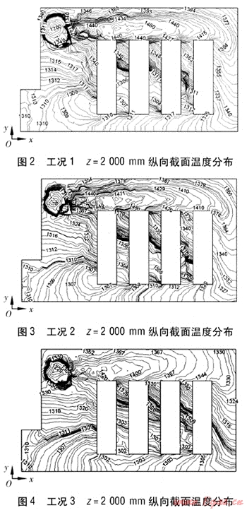 根據(jù)上述模型和運行參數(shù),燃氣和空氣通過后墻上的燃燒器噴入。3種工況在均熱爐中的燃燒模擬結果圖2~4,它們是通過z=2000mm縱向(爐長方向)上的截面。