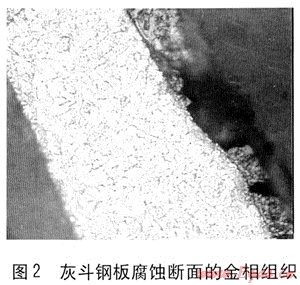 通過對鍋爐灰斗鋼板腐蝕斷面的金相組織分析(見圖2),腐蝕發(fā)生的機(jī)理主要是腐蝕介質(zhì)對鋼板的點(diǎn)蝕和沖蝕,由于點(diǎn)蝕和沖蝕的共同作用,使金屬表面的保護(hù)層剝離,腐蝕介質(zhì)與金屬直接接觸而發(fā)生腐蝕,含有顆粒等雜質(zhì)的高溫、高速煙氣連續(xù)不斷地直接沖擊金屬表面又進(jìn)一步造成鍋爐灰斗金屬表面的沖蝕,因此鍋爐灰斗在非常短的運(yùn)行時間內(nèi)就出現(xiàn)了穿孔失效的情況[4]。