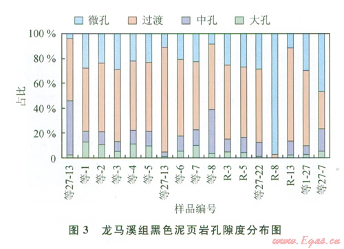 研究結果發(fā)現(xiàn),下志留統(tǒng)龍馬溪組頁巖樣品中大孔所占比例介于1.1%~12.9%,平均為5.7%;中孔所占比例介于3.5%~43.4%,平均為13.8%;過渡孔所占比例介于30.1%~83.9%,平均為57.68%;微孔所占比例介于3.9%~46.7%,平均為22.82%;空隙以過渡孔為主(圖3),微孔次之,兩種空隙合計所占比例介于61.4%~90.4%,平均為72.79%。
