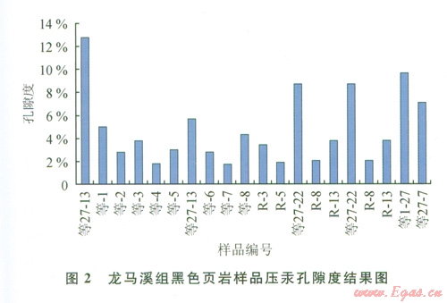 孔隙度是確定游離氣含量和評價頁巖滲透性的重要參數(shù)。頁巖氣儲層通常具有低孔隙度(小于l0%),低滲透率(小于0.001 mD)的特征。泥頁巖中通常同時存在原生孔隙和次生孔隙,原生孔隙系統(tǒng)由十分微細的孔隙組成,形成了大量的內表面積,從而提供了潛在的吸附位置,以存儲大量氣體,但原生孔隙系統(tǒng)滲透率很低。研究區(qū)內l7個下志留統(tǒng)龍馬溪組泥頁巖樣品的壓汞實驗結果表明:龍馬溪組黑色頁巖孔隙度介于1.71%~l2.75%,平均為4.71%,其頻度多分布在孔隙度超過4.0%的范圍,占到41.2%。相對于美國五大含氣頁巖3%~l4%的孔隙度而言,研究區(qū)龍馬溪組頁巖孔隙度屬于中等偏高。