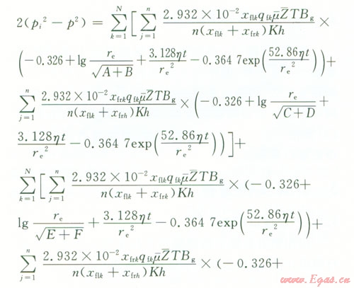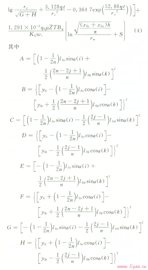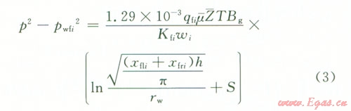 根據(jù)面積相等可得(xfli+ xfri)h=nRi2(式中xfli、xfri分別為第i條裂縫的左右翼的長度,Ri為氣藏的當(dāng)量半徑),所以第i條裂縫的流動可以看成是流動半徑為Ri,其中,地層厚度為ωi,邊界壓力的平方為裂縫尖端壓力平方p2(xfi,yfi,t),井底流壓為水平井井筒內(nèi)壓力pwfi的微型氣藏[7],其流動方式可以看成是氣藏的平面徑向流。根據(jù)氣井產(chǎn)能計算公式,可以把氣體由裂縫向井筒的滲流過程表示為: