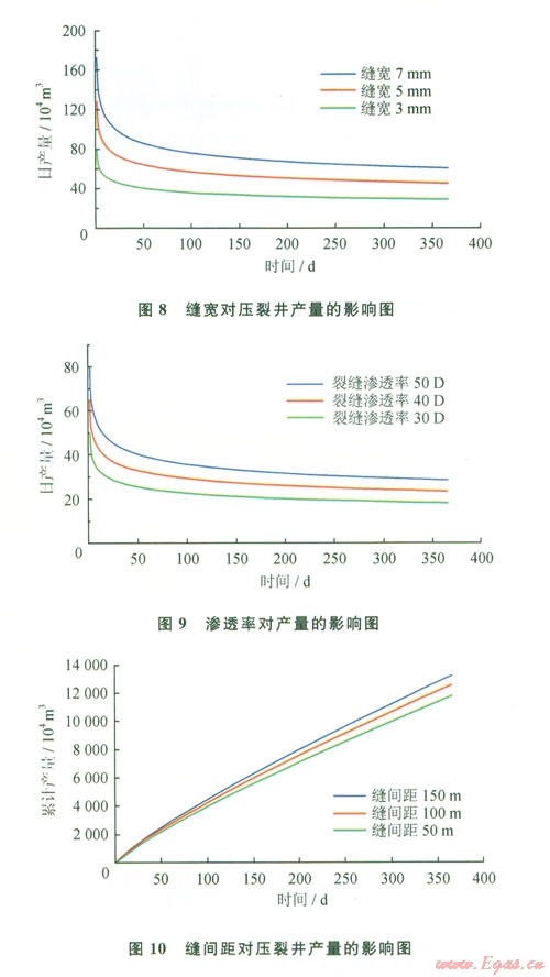 在前面相同的油藏參數(shù)基礎(chǔ)上,分別改變裂縫長度、裂縫寬度、裂縫滲透率、裂縫問距和方位角等輸人參數(shù),利用本模型可以模擬各個裂縫參數(shù)的變化對壓裂水平氣井產(chǎn)量的影響情況。