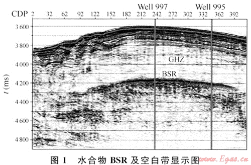 空白反射帶在反射地震剖面上通常與BSR伴生,位于BSR之上。在含天然氣水合物地層中,由于地震波速度增大,使得它與下伏地層之間的反射系數(shù)增大,在地震剖面上,天然氣水合物的底邊界出現(xiàn)相應(yīng)的強反射界面,而在含天然氣水合物的層內(nèi),由于沉積物孔隙被水合物充填膠結(jié),使地層變得均勻,減少波阻抗差,地震反射剖面上通常表現(xiàn)為弱振幅或振幅空白帶(圖1)。
