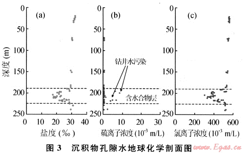 地球化學(xué)識別主要基于海底淺表層沉積物、沉積物中的自生礦物及底水的綜合分析和研究。淺層沉積物和底層海水的甲烷濃度異常高,通過對烴類氣體運移路徑的追蹤可以間接識別和評價天然氣水合物;淺層沉積物孔隙水含量和異常是識別水合物層的依據(jù),一般來說,含天然氣水合物的沉積層的孔隙水鹽度和氯度會降低(圖3)。其次孔隙水中的氧化-還原電位和硫酸鹽含量的降低也可能是天然氣水合物存在的標(biāo)志[8]。