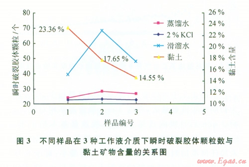 圖2顯示了頁巖的水化分散速度(m)與黏土礦物含量的關(guān)系。2%KCl及蒸餾水在高黏土礦物含量下,具有較好的抑制性能,而在低黏土礦物含量下,其抑制性能對(duì)黏土礦物含量的變化不敏感;而滑溜水的抑制性能相對(duì)較差,但其抑制性能與黏土含量相關(guān)。圖3顯示了瞬時(shí)形成膠體顆粒數(shù)目(b)值與黏土礦物含量的關(guān)系。3種液體都顯示出在高黏土礦物含量情況下,抑制性能較好。