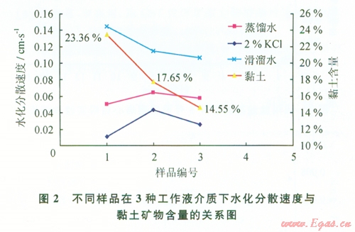 從表2可以看出:①l號(hào)樣品測(cè)試結(jié)果中,2%KCl的頁巖的水化分散速度(m)值最小,瞬時(shí)形成膠體顆粒數(shù)目(b)值也最?。欢锼?span lang="EN-US">A號(hào)兩項(xiàng)參數(shù)均最高。②2號(hào)和3號(hào)樣品測(cè)試結(jié)果與l號(hào)樣品結(jié)果規(guī)律一致。
