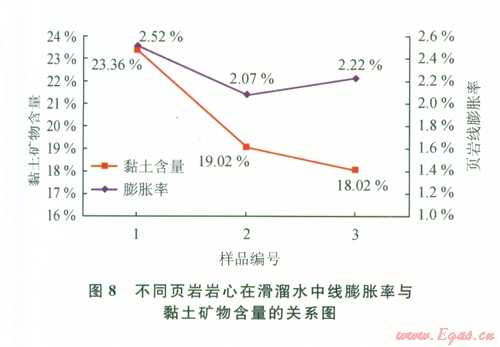 通過對(duì)實(shí)驗(yàn)結(jié)果的綜合分析,認(rèn)為頁巖的膨脹性與黏土礦物含量存在一定的相關(guān)性,當(dāng)黏土礦物含量變化較大時(shí),頁巖的膨脹率與黏土礦物含量關(guān)系更為密切。
